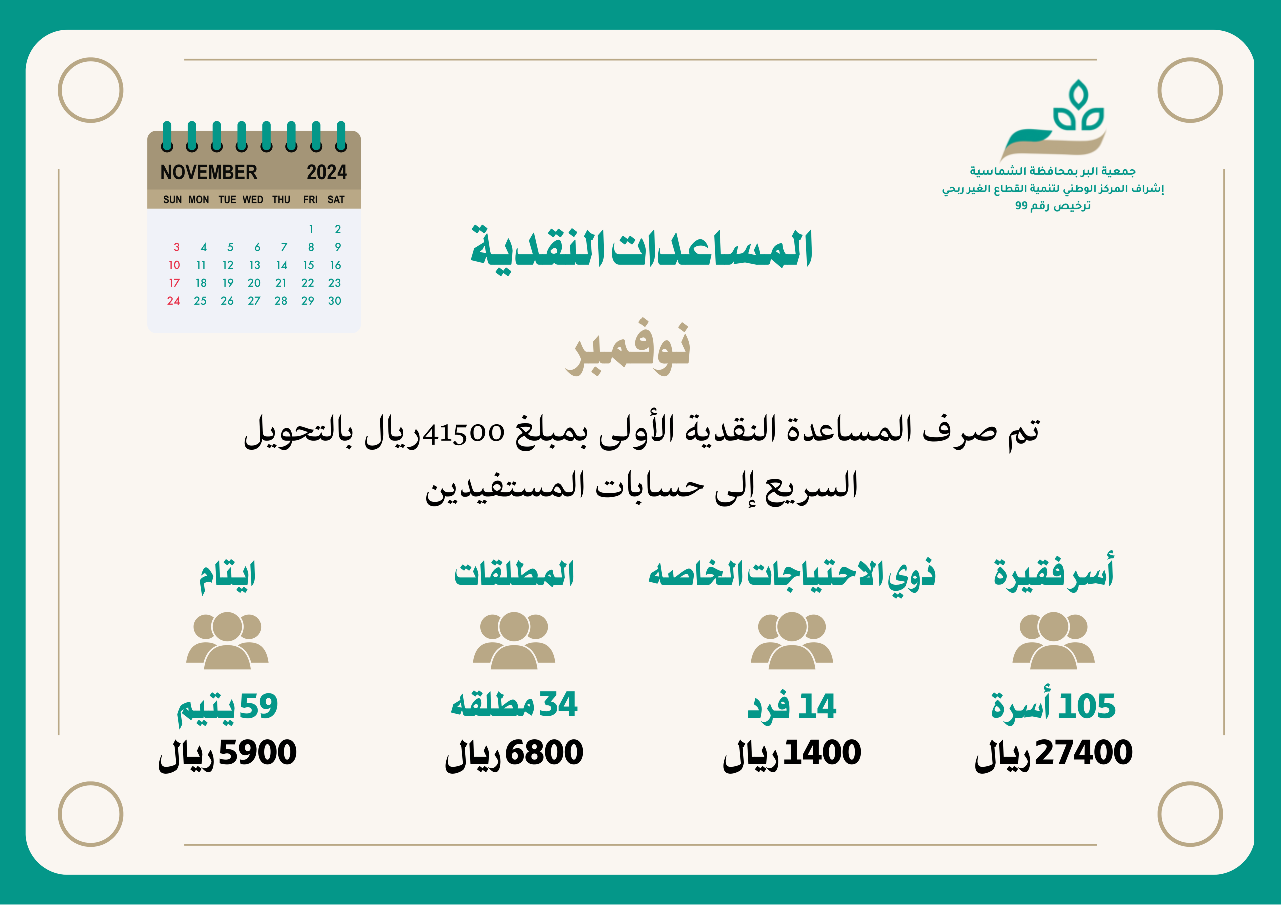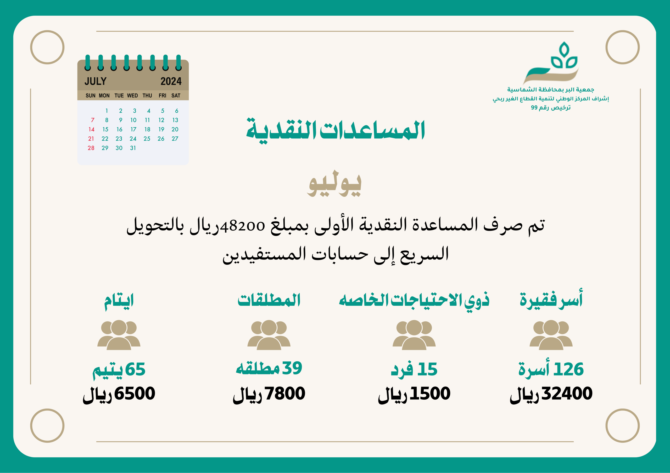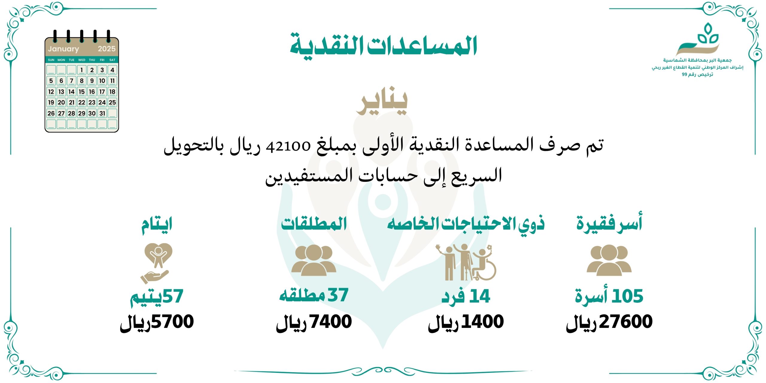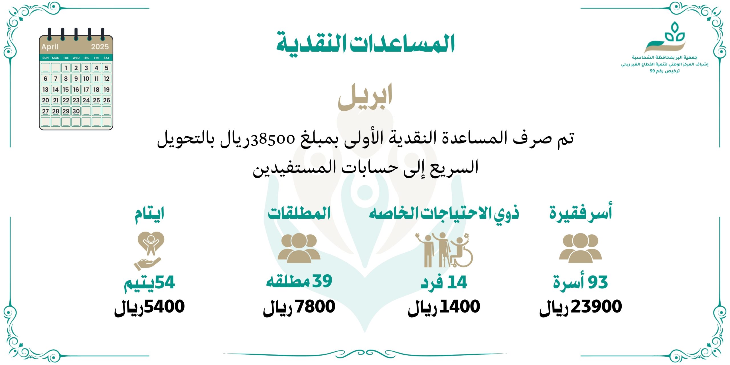 ⇐ في 2023/04/27 تم صرف المساعدة النقدية الأولى بمبلغ 47000ريال بالتحويل السريع إلى حسابات المستفيدين البنكية كالتالي: