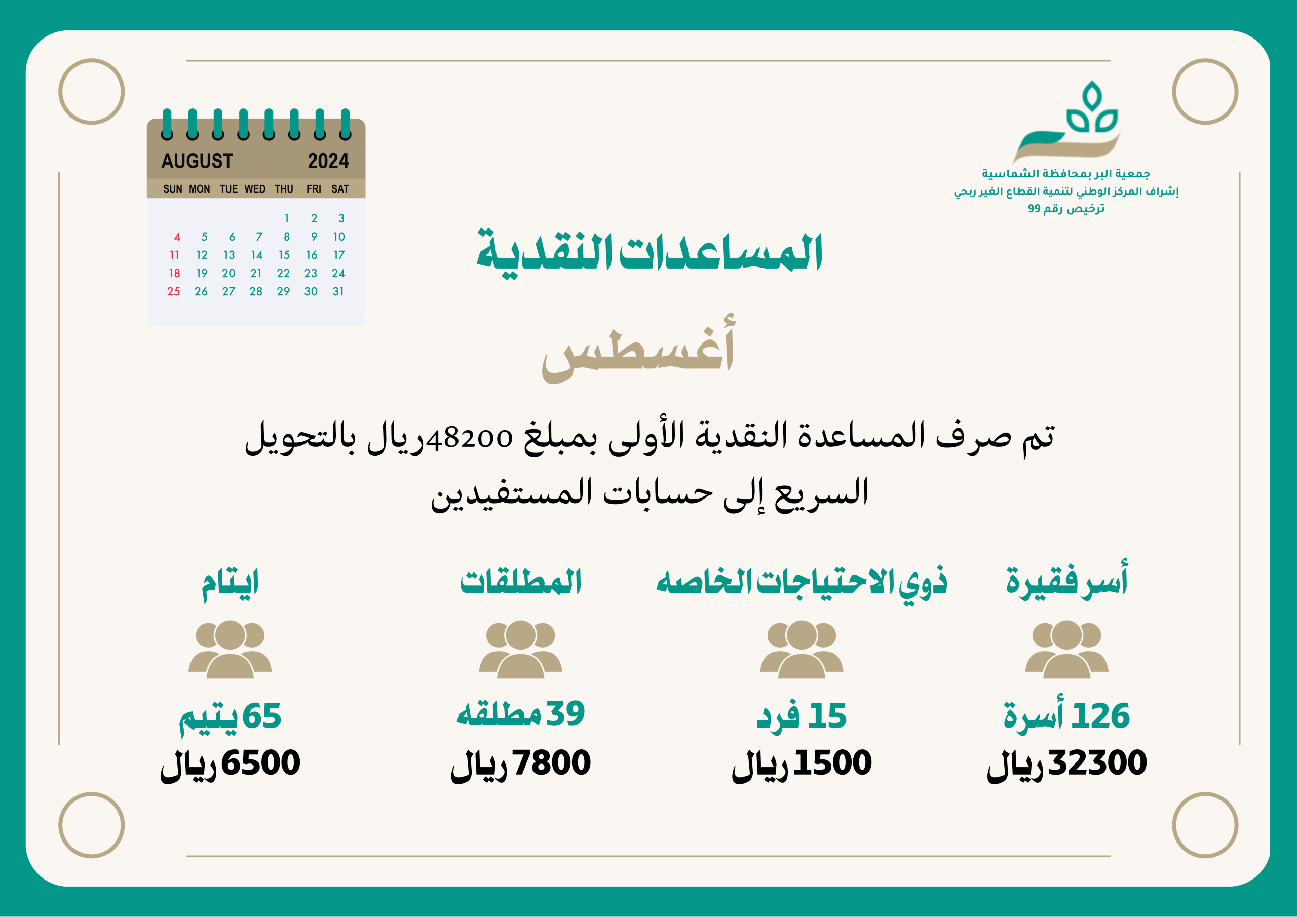 ⇐ في 2023/08/27 تم صرف المساعدة النقدية الأولى بمبلغ 48000ريال بالتحويل السريع إلى حسابات المستفيدين البنكية كالتالي: