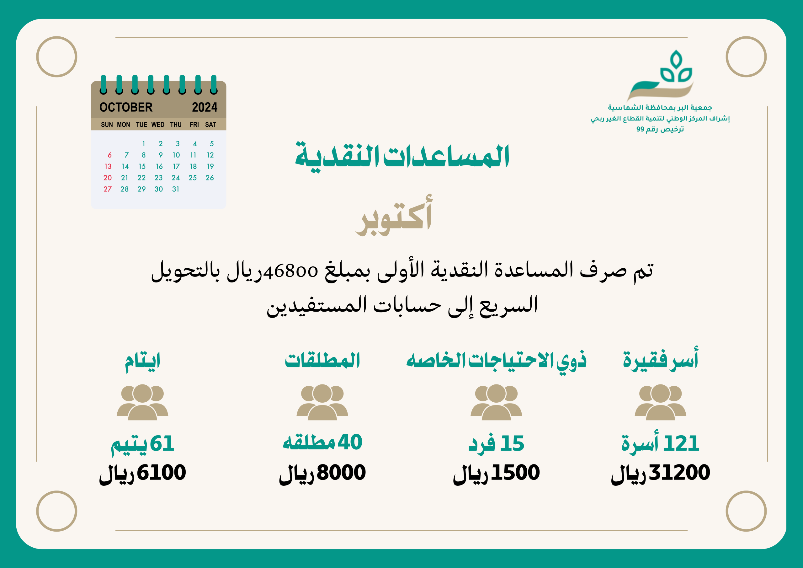 ⇐ في 2023/10/27 تم صرف المساعدة النقدية الأولى بمبلغ 47800ريال بالتحويل السريع إلى حسابات المستفيدين البنكية كالتالي: