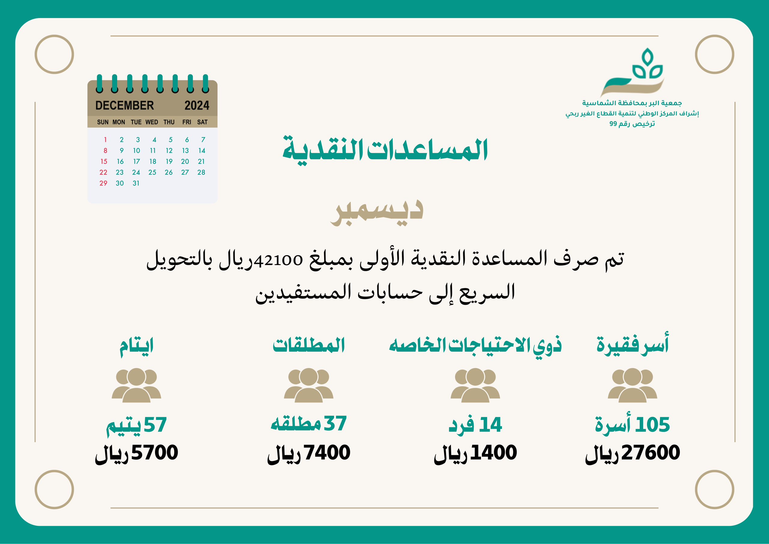 ⇐ في2023/12/29تم صرف المساعدة النقدية الأولى بمبلغ 48000ريال بالتحويل السريع إلى حسابات المستفيدين البنكية كالتالي: