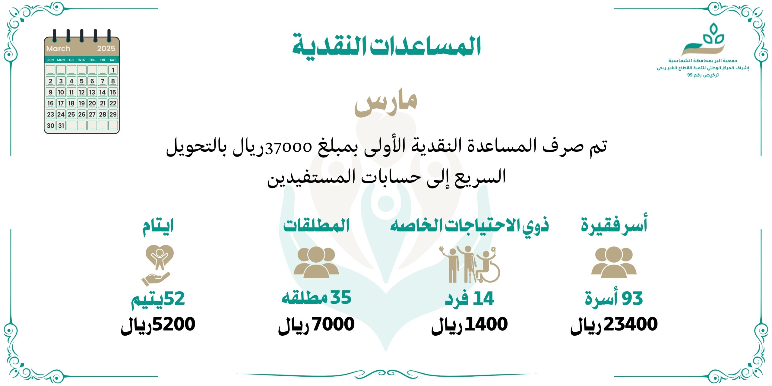 ⇐ في2024/03/29تم صرف المساعدة النقدية الأولى بمبلغ 37000ريال بالتحويل السريع إلى حسابات المستفيدين البنكية كالتالي: