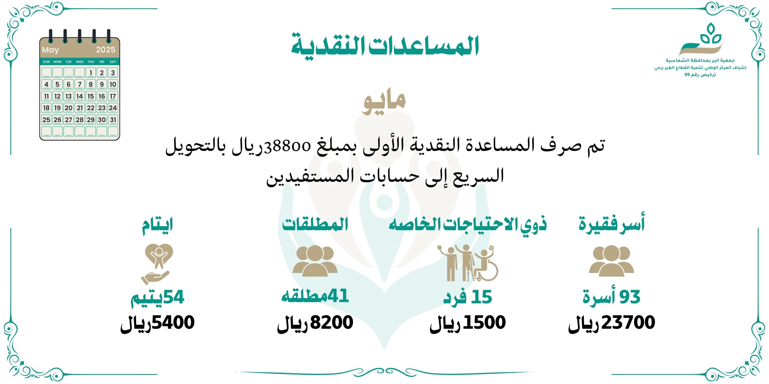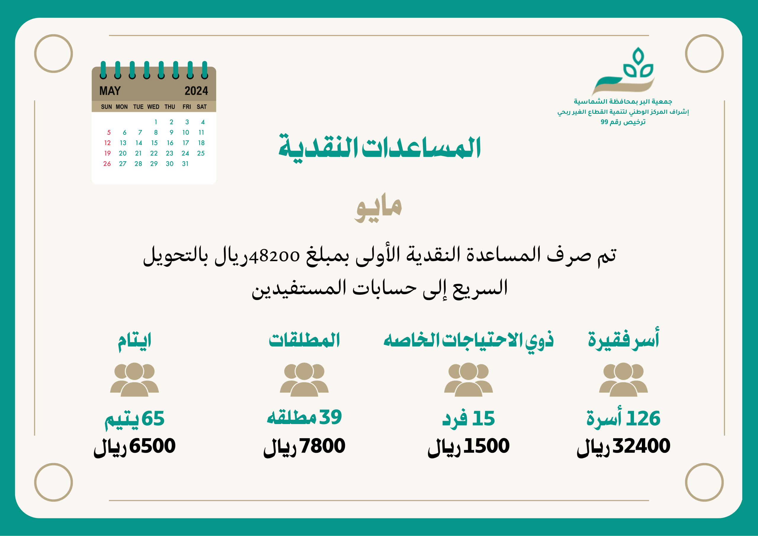 ⇐ في 2023/05/27 تم صرف المساعدة النقدية الأولى بمبلغ 47000ريال بالتحويل السريع إلى حسابات المستفيدين البنكية كالتالي: