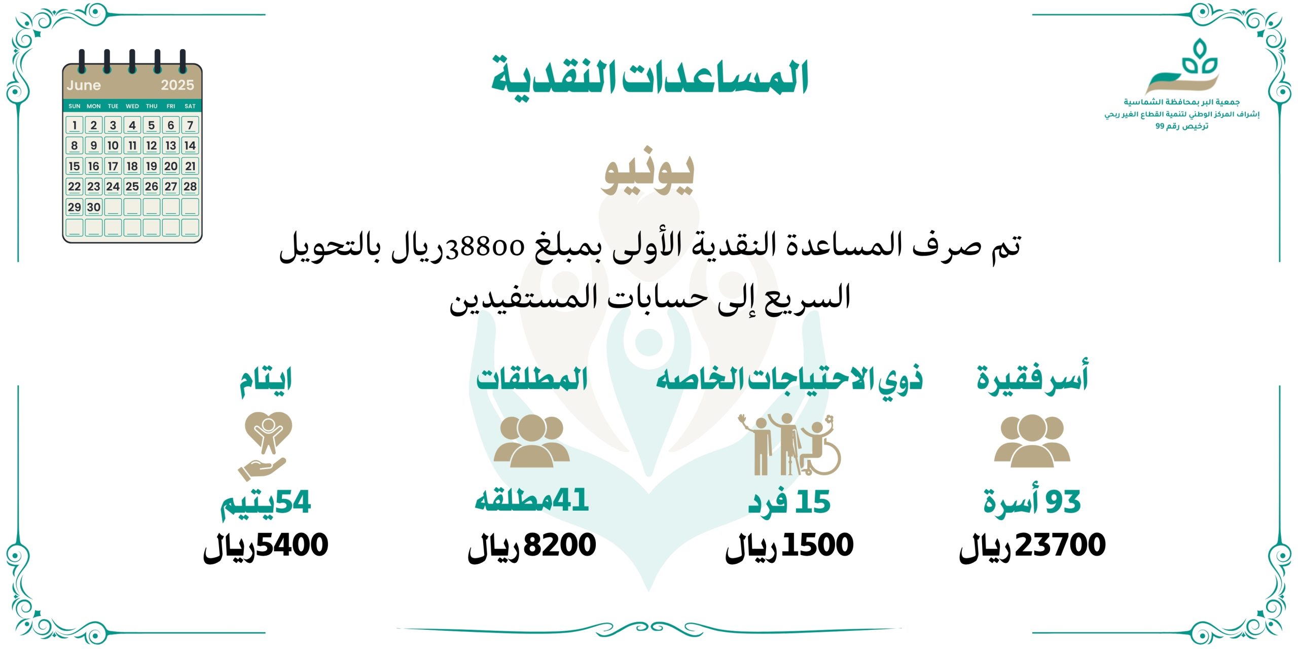 ⇐ في 2023/06/27 تم صرف المساعدة النقدية الأولى بمبلغ 47000ريال بالتحويل السريع إلى حسابات المستفيدين البنكية كالتالي: