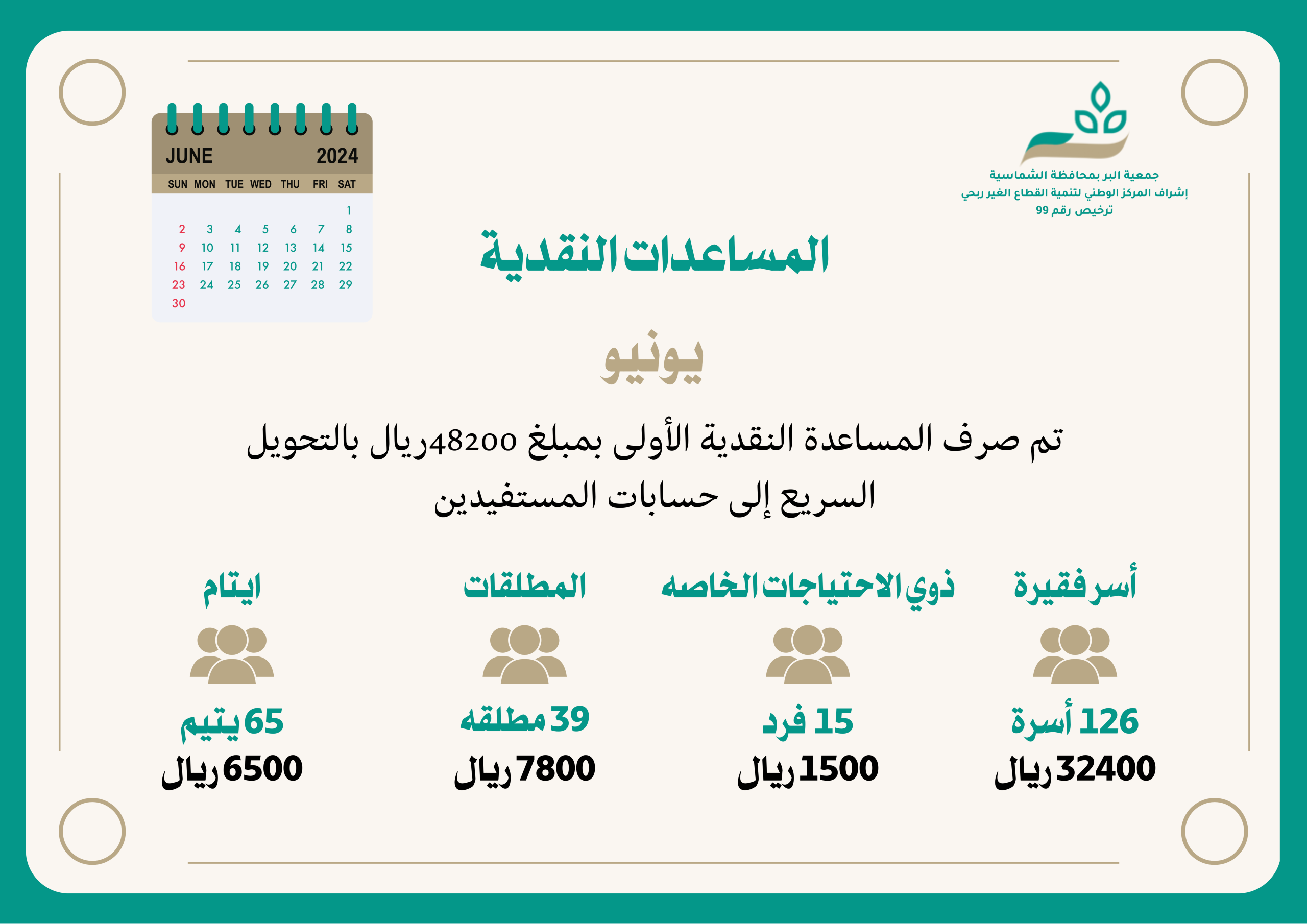 ⇐ في2024/5/29تم صرف المساعدة النقدية الأولى بمبلغ 48200ريال بالتحويل السريع إلى حسابات المستفيدين البنكية كالتالي: