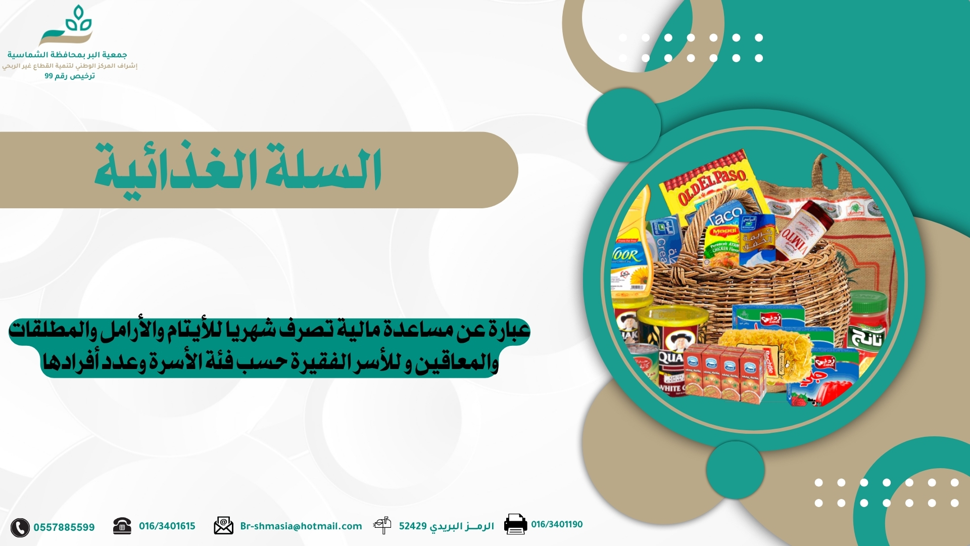 التعريف : عبارة عن سلة غذائية لجميع الأسر المستفيد، توزع كل ثلاثة شهور بسيارات الجمعية إلى منازلهم