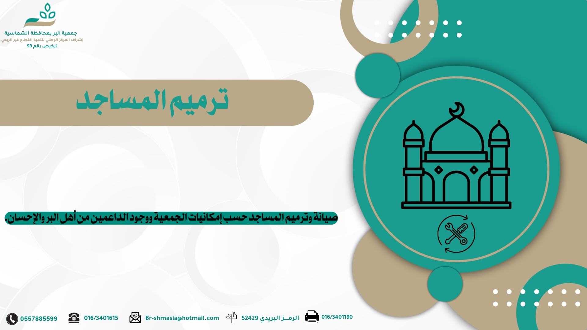 التعريف:  صيانة وترميم المساجد حسب إمكانيات الجمعية ووجود الداعمين من أهل البر والإحسان.